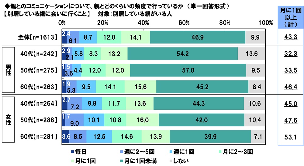 別居している親がいる人(1,613名)に、【別居している親に会いに行く】頻度を聞いたところ、「月に1回以上」は43.3%で「月に1回未満」(46.9%)とほぼ同じ割合となり、会いに行かない人の割合(「しない」)は9.9%となりました。