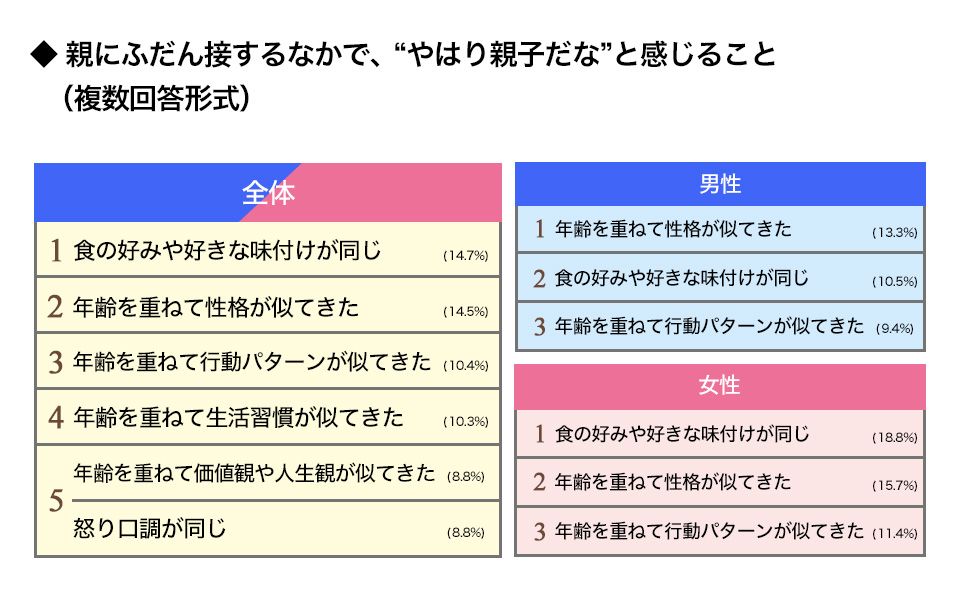 親にふだん接するなかで、“やはり親子だな”と感じることを聞いたところ、1位は「食の好みや好きな味付けが同じ」、2位は「年齢を重ねて性格が似てきた」、3位は「年齢を重ねて行動パターンが似てきた」。男性では「年齢を重ねて性格が似てきた」、女性では「食の好みや好きな味付けが同じ」が1位でした。