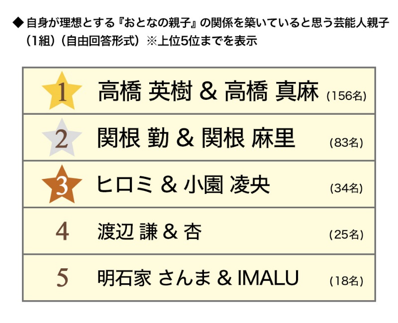 自身が理想とする『おとなの親子』の関係を築いていると思う芸能人親子(1組)を聞いたところ、親子揃ってテレビ番組やイベントなどに出演することが多く、会話からも仲の良さが自然と伝わる「高橋 英樹さん&高橋 真麻さん」がトップとなり、2位「関根 勤さん&関根 麻里さん」、3位「ヒロミさん&小園 凌央さん」、4位「渡辺 謙さん&杏さん」、5位「明石家 さんまさん&IMALUさん」と続きました。