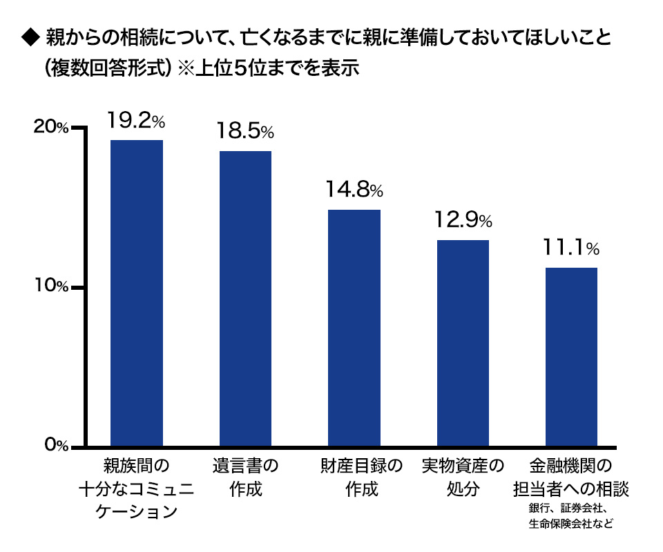 親からの相続について、亡くなるまでに親に準備しておいてほしいことを聞いたところ、1位は「親族間の十分なコミュニケーション」、2位は「遺言書の作成」、3位は「財産目録の作成」、4位は「実物資産の処分」、5位は「金融機関の担当者への相談」でした。