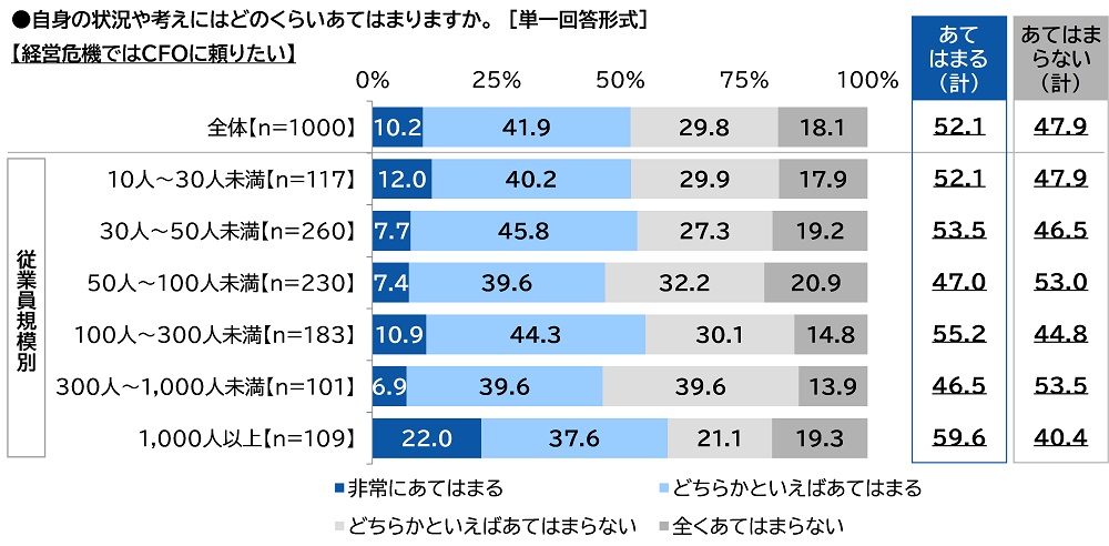【経営危機ではCFOに頼りたい】では、『あてはまる(計)』は52.1%、『あてはまらない(計)』は47.9%となりました。