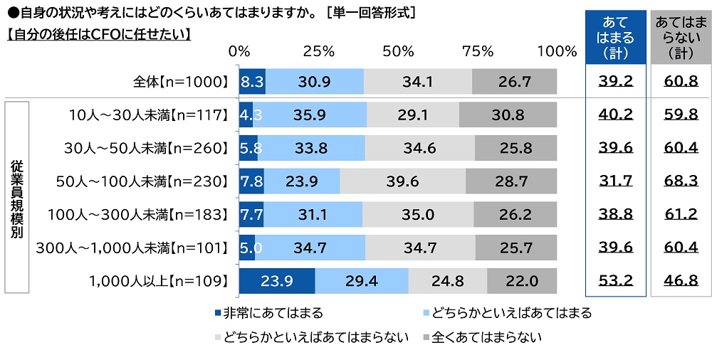 「自分の後任はCFOに任せたい」39%、従業員規模1,000人以上では53%