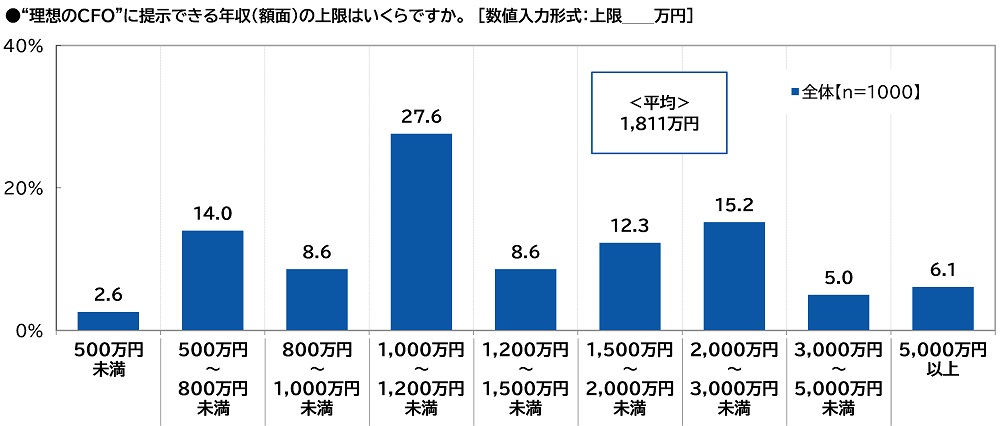 全回答者(1,000名)に、“理想のCFO”に提示できる年収(額面)の上限はいくらか聞いたところ、「1,000万円~1,200万円未満」(27.6%)や「2,000万円~3,000万円未満」(15.2%)に多くの回答が集まり、平均は1,811万円となりました。
