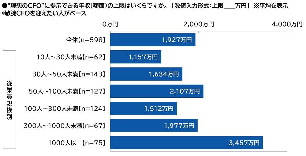 また、敏腕CFOを迎えたい人(598名)では平均1,927万円となり、従業員規模1,000人以上かつ敏腕CFOを迎えたい人(75名)では平均3,457万円でした。