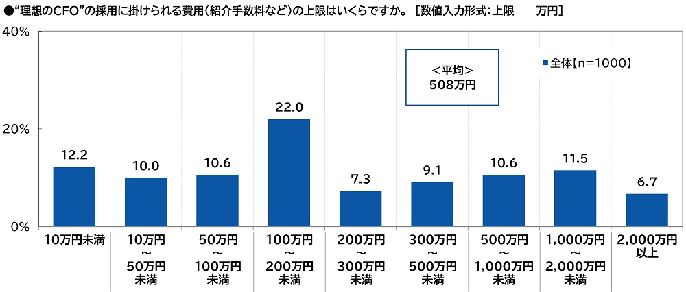 また、“理想のCFO”の採用に掛けられる費用(紹介手数料など)の上限はいくらか聞いたところ、「100万円~200万円未満」(22.0%)に多くの回答が集まったほか、「10万円未満」(12.2%)や「10万円~50万円未満」(10.0%)、「50万円~100万円未満」(10.6%)、「500万円~1,000万円未満」(10.6%)、「1,000万円~2,000万円未満」(11.5%)に回答が分かれ、平均は508万円となりました。
