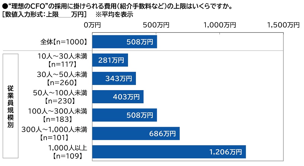 “理想のCFO”の採用に掛けられる費用の上限 平均は508万円、従業員規模1,000人以上では平均1,206万円