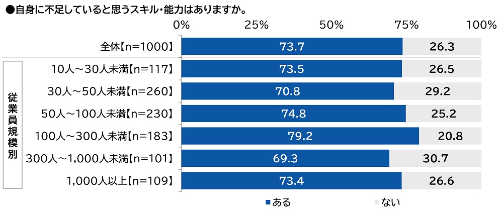また、自身に不足していると思うスキル・能力はあるか聞いたところ、「ある」は73.7%、「ない」は26.3%となりました。