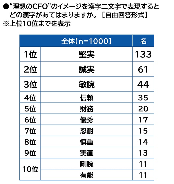 “理想のCFO”のイメージを漢字二文字で表すと? 1位「堅実」2位「誠実」3位「敏腕」