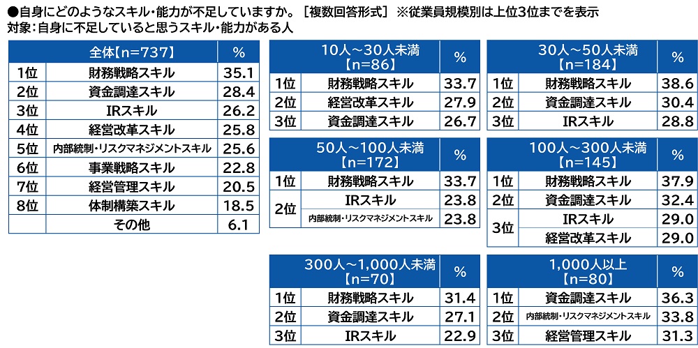 従業員規模別にみると、従業員規模1,000人以上では1位「資金調達スキル」(36.3%)、2位「内部統制・リスクマネジメントスキル」(33.8%)、3位「経営管理スキル」(31.3%)となりました。