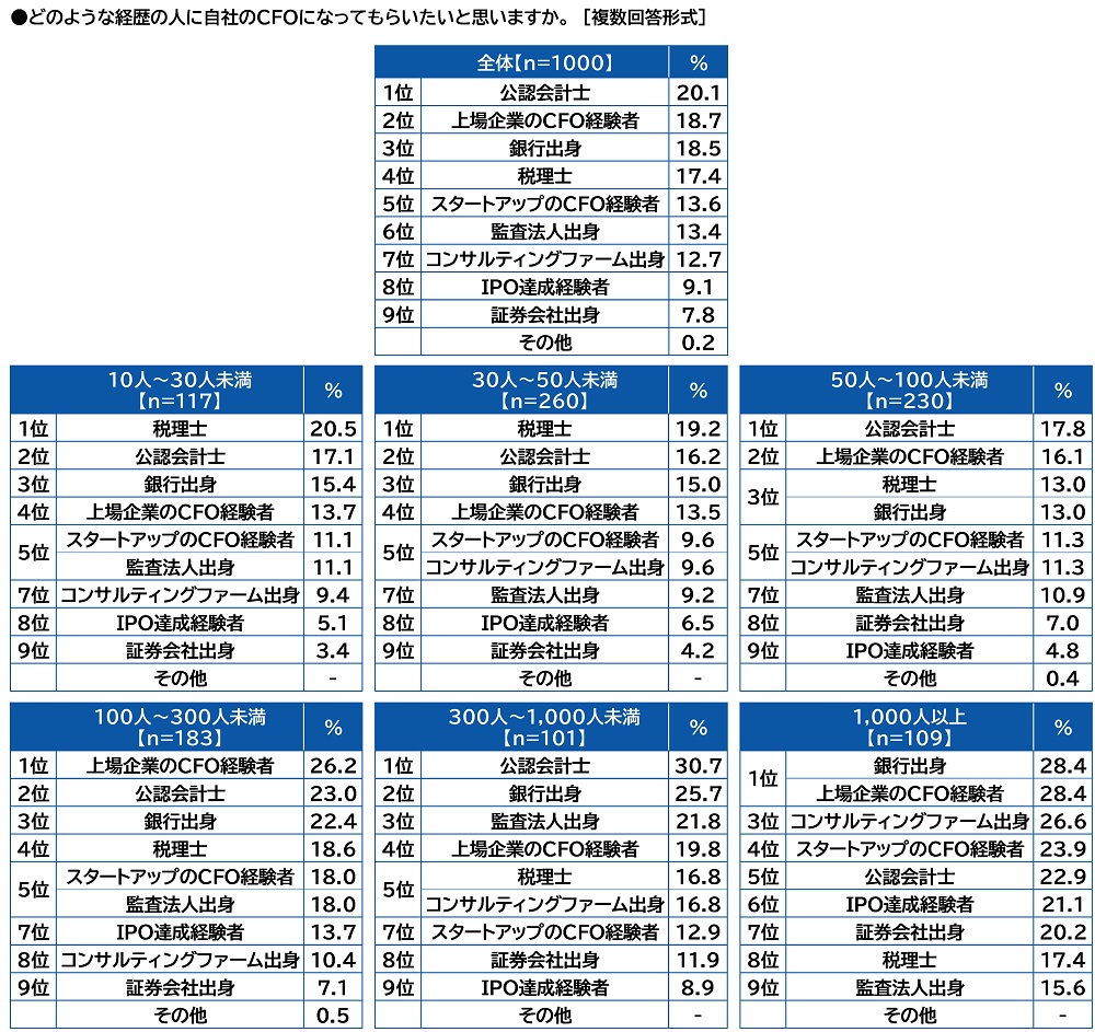 従業員規模1,000人以上では「銀行出身」と「上場企業のCFO経験者」が同率1位