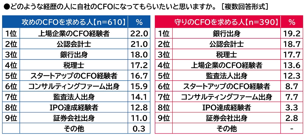 ここで、どのような経歴の人に自社のCFOになってもらいたいと思うかをみると、攻めのCFOを求める人(610名)では1位「上場企業のCFO経験者」(22.0%)、2位「公認会計士」(21.0%)、3位「銀行出身」(18.0%)となりました。上場企業で実際にCFOとして資本市場に向き合う実務経験を有した人に任せたいと思う人が多いようです。他方、守りのCFOを求める人(390名)では1位「銀行出身」(19.2%)、2位「公認会計士」(18.7%)、3位「税理士」(17.7%)となりました。