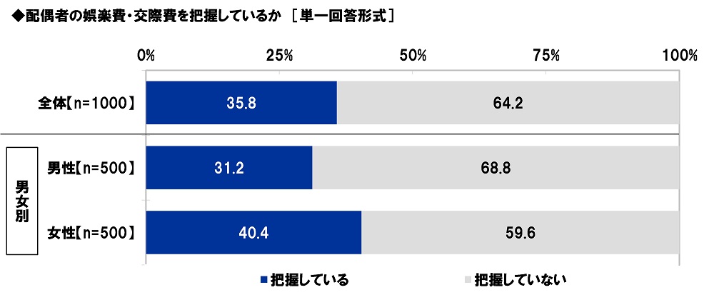 全回答者(1,000名)に、配偶者の娯楽費・交際費を把握しているか聞いたところ、「把握している」は35.8%、「把握していない」は64.2%となりました。
