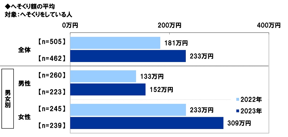 昨年の調査結果と比較すると、へそくり額の平均は、全体では2022年181万円→2023年233万円と、52万円増加しました。男女別にみると、女性では76万円の大幅増加(2022年233万円→2023年309万円)となりました。値上げラッシュで経済的な不安が高まるなか、将来リスクに備えるためにへそくりを増やした女性が多いのではないでしょうか。