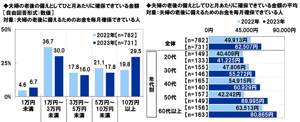 夫婦の老後に備えるために確保できている金額 平均62,507円/月、昨年調査から12,594円の大幅増加