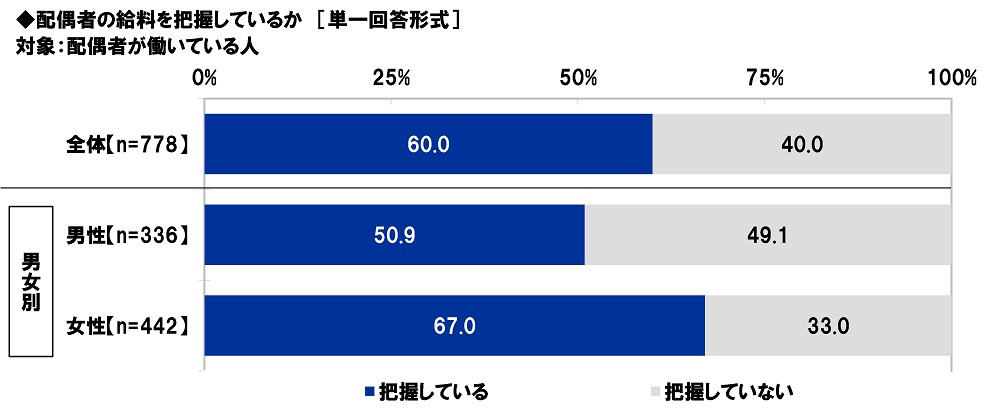 配偶者が働いている人(778名)に、配偶者の給料を把握しているか聞いたところ、「把握している」は60.0%、「把握していない」は40.0%となりました。
