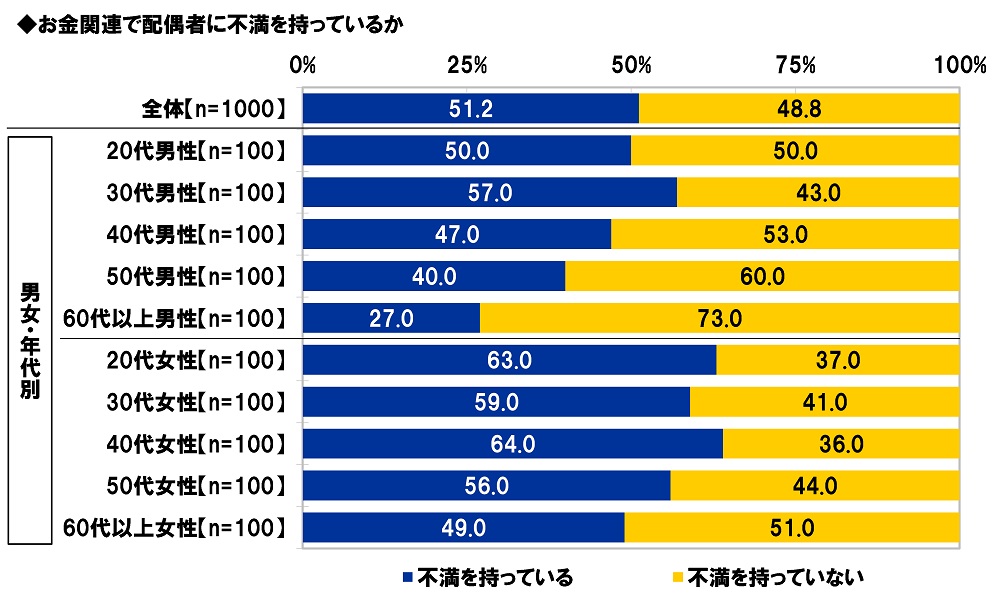 「お金関連で配偶者に不満を持っている」51%、40代女性では64%