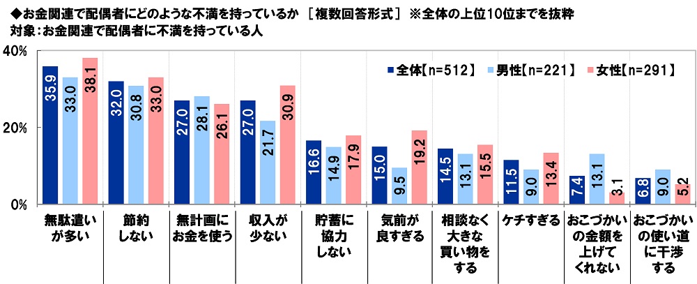 お金関連で配偶者に不満を持っている人(512名)に、お金関連で配偶者にどのような不満を持っているか聞いたところ、「無駄遣いが多い」(35.9%)が最も高くなり、次いで、「節約しない」(32.0%)、「無計画にお金を使う」「収入が少ない」(いずれも27.0%)、「貯蓄に協力しない」(16.6%)となりました。値上げラッシュで家計負担が増大するなか、パートナーの出費に関して不満を抱えている人が多いようです。