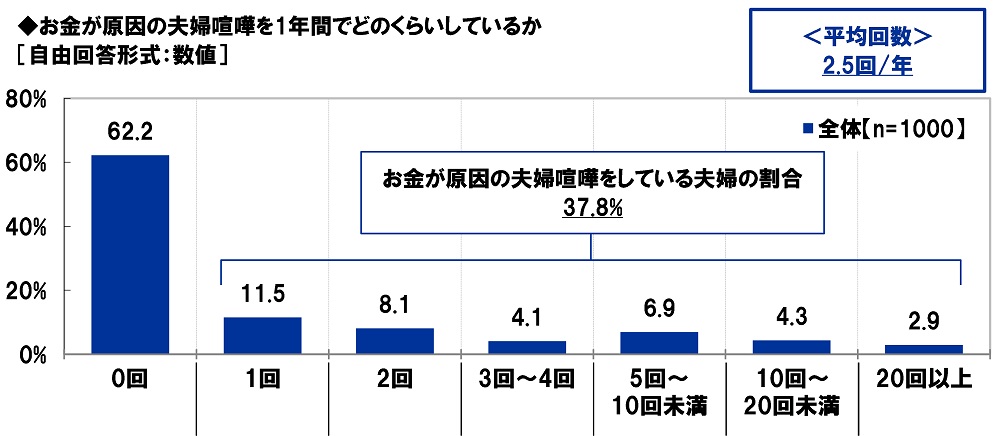 全回答者(1,000名)に、お金が原因の夫婦喧嘩を1年間でどのくらいしているか聞いたところ、「0回」が62.2%、『お金が原因の夫婦喧嘩をしている夫婦の割合』(1回以上と回答した人の割合)は37.8%でした。お金が原因の夫婦喧嘩の回数は平均2.5回/年となりました。