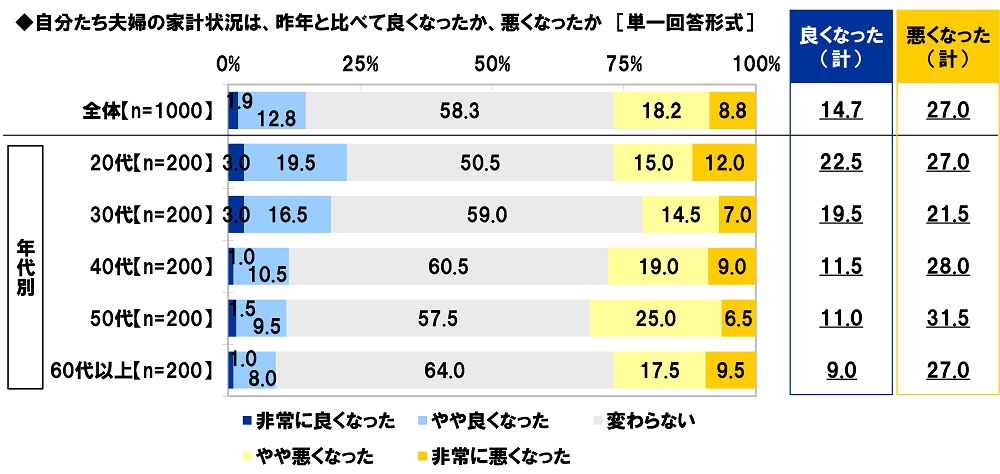 「夫婦の家計状況が昨年より悪くなった」27%、50代では32%