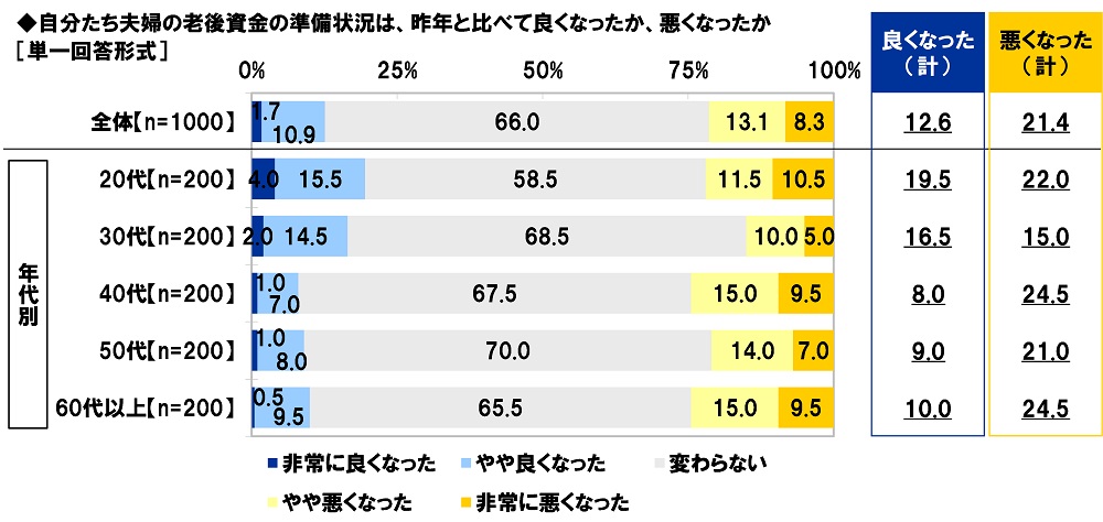 「夫婦の老後資金の準備状況が昨年より悪くなった」21%、40代と60代以上では25%