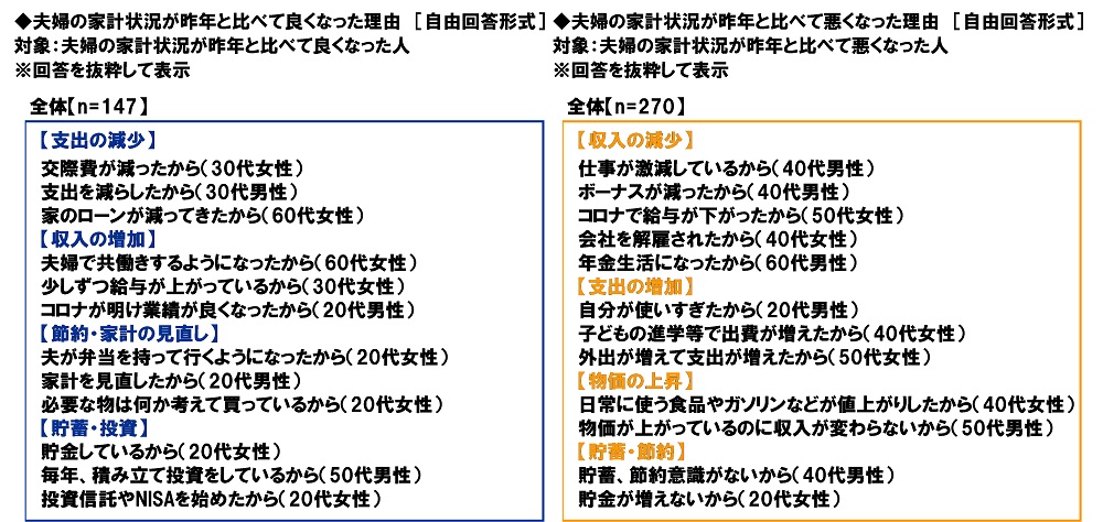 夫婦の家計状況が昨年と比べて良くなった人(147名)に、夫婦の家計状況が良くなった理由を聞いたところ「交際費が減ったから(30代女性)」、「支出を減らしたから(30代男性)」といった支出の減少に関する回答や、「少しずつ給与が上がっているから(30代女性)」、「コロナが明け業績が良くなったから(20代男性)」といった収入の増加に関する回答が挙げられました。また、「家計を見直したから(20代男性)」、「必要な物は何か考えて買っているから(20代女性)」といった節約・家計の見直しに関する回答や、「貯金しているから(20代女性)」、「投資信託やNISAを始めたから(20代女性)」といった貯蓄・投資に関する回答が挙げられ、家計状況の改善のために消費行動を見直したり、積極的に資産形成を行ったりしたケースがあるようです。