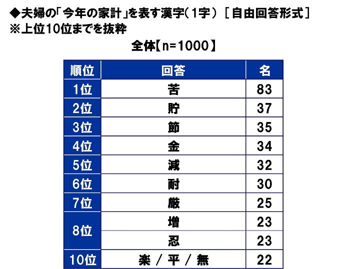 全回答者(1,000名)に、夫婦の“今年の家計”を表す漢字(1字)を聞いたところ、「苦」(83名)がダントツとなり、2位「貯」(37名)、3位「節」(35名)、4位「金」(34名)、5位「減」(32名)と続きました。