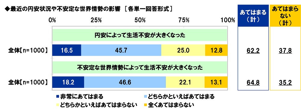 「円安によって生活不安が大きくなった」62%、「不安定な世界情勢によって生活不安が大きくなった」65%