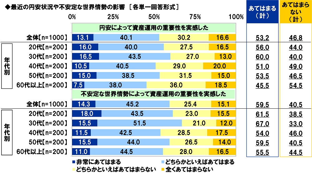 「不安定な世界情勢によって資産運用の重要性を実感した」60%、30代では67%