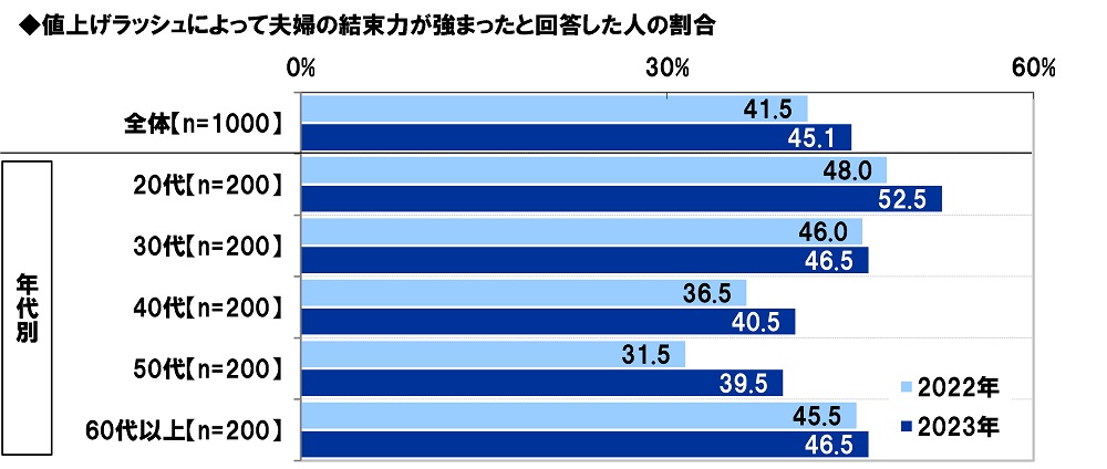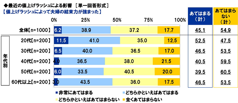 「値上げラッシュによって夫婦の結束力が強まった」45%、昨年調査から4ポイント上昇