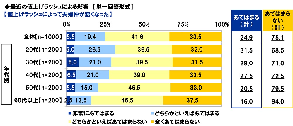 「値上げラッシュによって夫婦仲が悪くなった」25%、昨年調査から9ポイント上昇