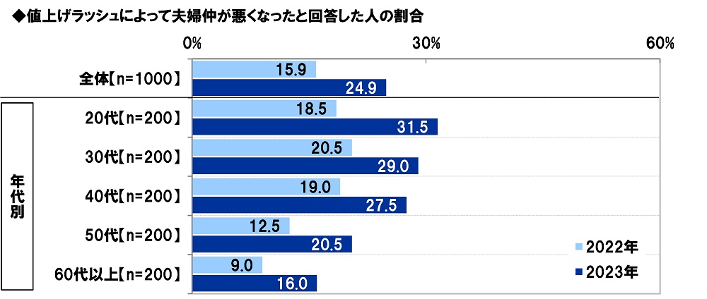 年代別にみると、値上げラッシュによって夫婦仲が悪くなったと回答した人の割合は、すべての年代で上昇しており、20代では13.0ポイント上昇(2022年18.5%→2023年31.5%)と、他の年代と比べて上昇幅が大きくなりました。