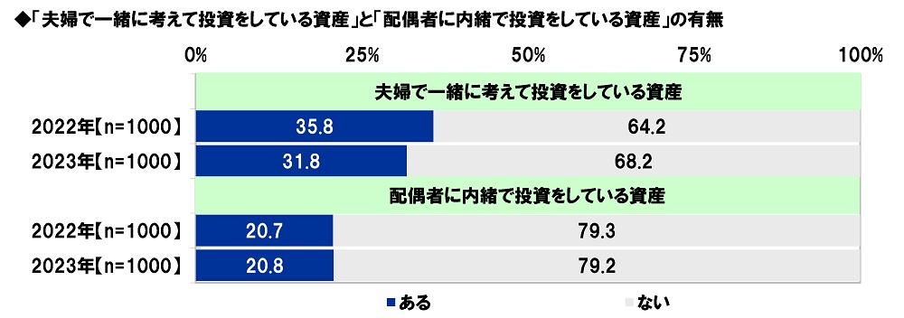 全回答者(1,000名)に、“夫婦で一緒に考えて投資をしている資産”と“配偶者に内緒で投資をしている資産”の有無を聞いたところ、“夫婦で一緒に考えて投資をしている資産”がある人の割合は31.8%、“配偶者に内緒で投資をしている資産”がある人の割合は20.8%となりました。