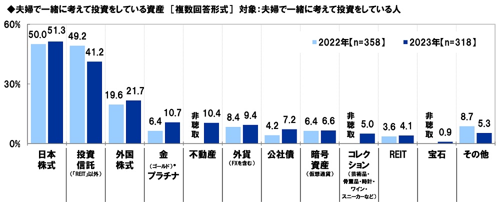 夫婦で一緒に考えて投資をしている人(318名)に、夫婦で一緒に考えて投資をしている資産を聞いたところ、「日本株式」(51.3%)が最も高くなり、「投資信託(「REIT」以外)」(41.2%)、「外国株式」(21.7%)、「金(ゴールド)・プラチナ」(10.7%)、「不動産」(10.4%)が続きました。
