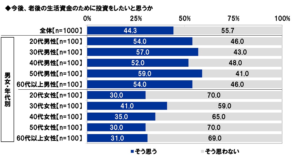 「老後の生活資金のために投資をしたい」44%、50代男性では59%