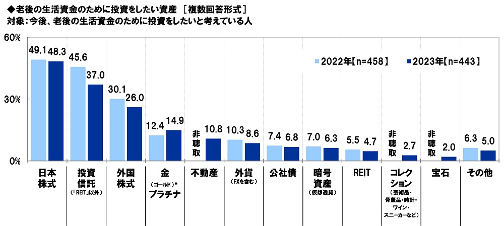 今後、老後の生活資金のために投資をしたいと考えている人(443名)に、どのような資産に投資をしたいか聞いたところ、「日本株式」(48.3%)が最も高くなり、「投資信託(「REIT」以外)」(37.0%)、「外国株式」(26.0%)、「金(ゴールド)・プラチナ」(14.9%)、「不動産」(10.8%)が続きました。