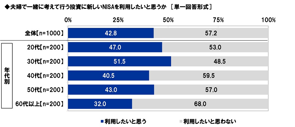 「夫婦で一緒に考えて行う投資に新しいNISAを利用したい」43%、30代では52%