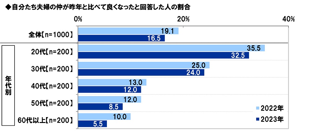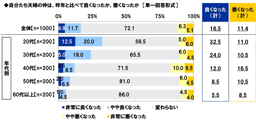 「夫婦の仲が昨年より良くなった」17%、20代では33%、60代以上では6%