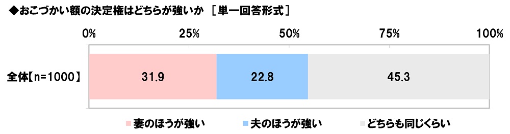 全回答者(1,000名)に、おこづかい額の決定権はどちらが強いか聞いたところ、「妻のほうが強い」は31.9%、「夫のほうが強い」は22.8%、「どちらも同じくらい」は45.3%となりました。