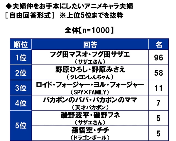 夫婦仲をお手本にしたいアニメキャラ夫婦を聞いたところ、1位「フグ田マスオ・フグ田サザエ(サザエさん)」(96名)、2位「野原ひろし・野原みさえ(クレヨンしんちゃん)」(58名)、3位「ロイド・フォージャー・ヨル・フォージャー(SPY×FAMILY)」(11名)、4位「バカボンのパパ・バカボンのママ(天才バカボン)」(7名)、5位「磯野波平・磯野フネ(サザエさん)」「孫悟空・チチ(ドラゴンボール)」(いずれも5名)となりました。明るく朗らかなサザエさんと、優しく家族思いなマスオさんの仲睦まじさをお手本にしたいと思う人が多いのではないでしょうか。