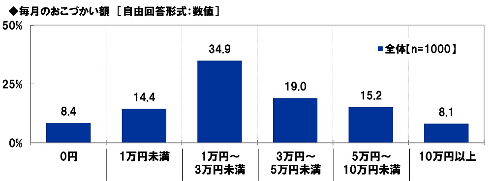 毎月のおこづかい額(=ひと月に自由に使えるお金)はどのくらいか聞いたところ、「1万円~3万円未満」(34.9%)に多くの回答が集まり、平均は30,831円となりました。