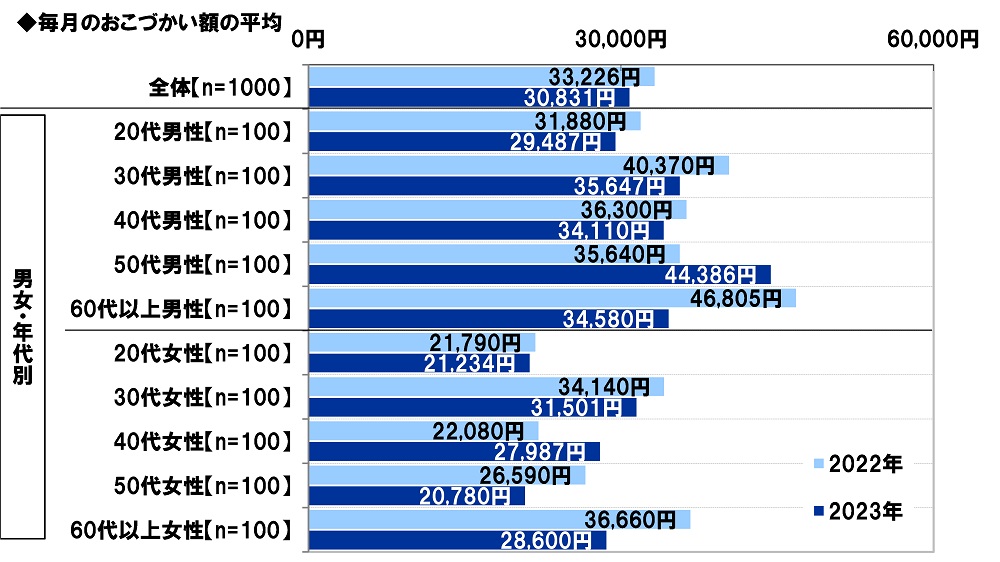 昨年の調査結果と比較すると、毎月のおこづかい額の平均は、2022年33,226円→2023年30,831円と、2,395円減少しました。物価上昇による節約意識の高まりによって、おこづかいに回す金額が減少したと推察されます。男女・年代別にみると、毎月のおこづかい額の平均は、60代以上男性では12,225円減少(2022年46,805円→2023年34,580円)、60代以上女性では8,060円減少(2022年36,660円→2023年28,600円)と、他の年代と比べて減少幅が大きくなりました。