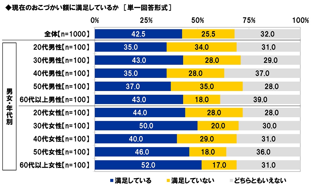 「毎月のおこづかい額に満足している」43%、60代以上女性では52%