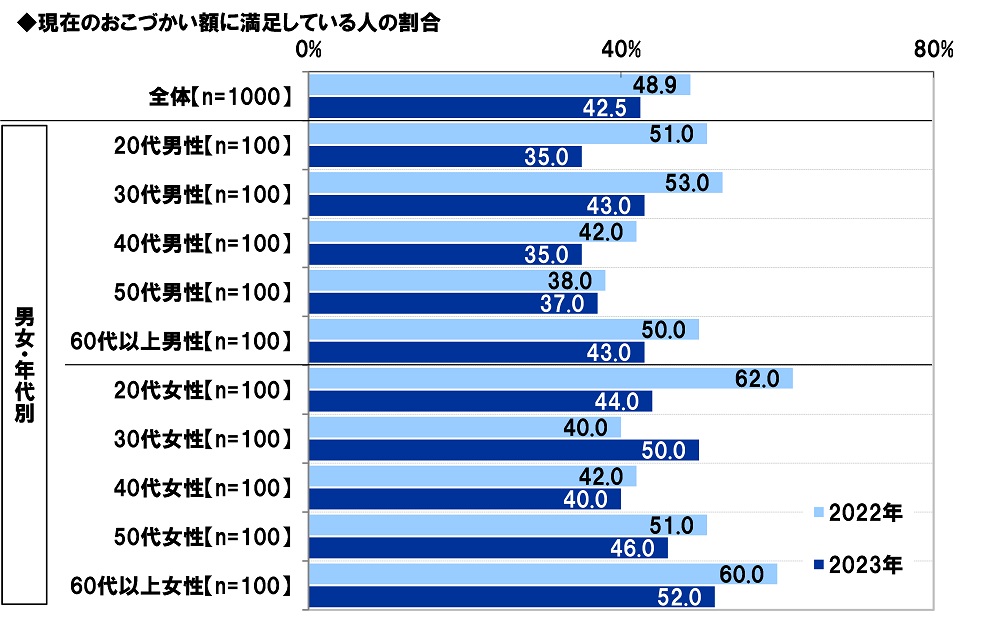 昨年の調査結果と比較すると、現在のおこづかい額に満足している人の割合は、男女とも20代で下降幅が大きく、20代男性では16.0ポイントの下降(2022年51.0%→2023年35.0%)、20代女性では18.0ポイントの下降(2022年62.0%→2023年44.0%)となりました。新型コロナの5類移行後、若年層には、レジャーや友人との交流に使えるお金が足りないと感じる人が増えているのではないでしょうか。