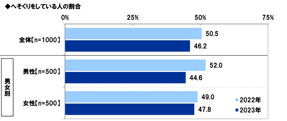 昨年の調査結果と比較すると、へそくりをしている人の割合は、2022年50.5%→2023年46.2%と4.3ポイント下降しました。男女別にみると、男性では7.4ポイントの下降(2022年52.0%→2023年44.6%)となりました。
