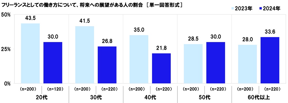 フリーランスとしての働き方についての将来への展望 比較的若い世代で昨年に比べ大幅な下降