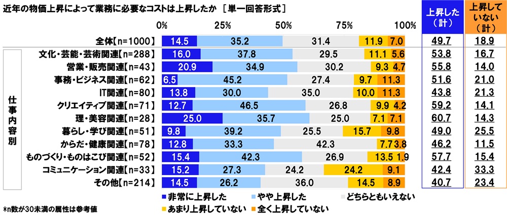 「近年の物価上昇によって業務に必要なコストが上昇した」49.7%、クリエイティブ関連では59.2%