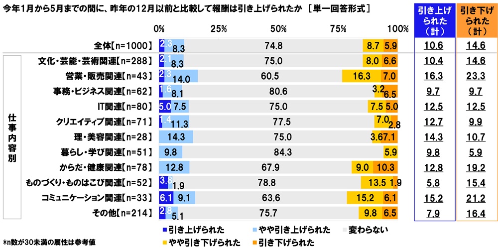 仕事内容別にみると、報酬が引き下げられた人の割合は、営業・販売関連(23.3%)とコミュニケーション関連(21.2%)では2割を超えました。