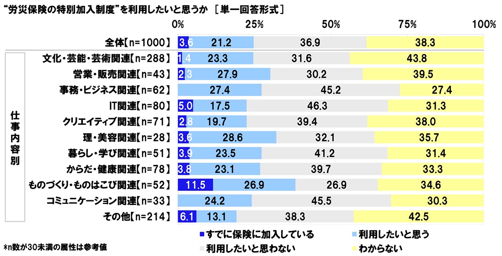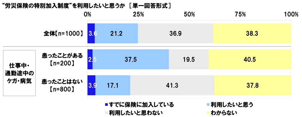 全回答者(1,000名)に、“労災保険の特別加入制度”を利用したいと思うか聞いたところ、「すでに保険に加入している」は3.6%、「利用したいと思う」は21.2%、「利用したいと思わない」は36.9%、「わからない」は38.3%となりました。