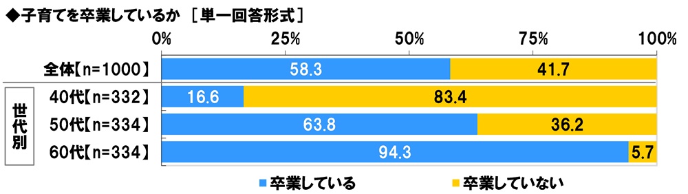 まず、全回答者(1,000名)に、子育てを卒業しているか聞いたところ、「卒業している」は58.3%、「卒業していない」は41.7%となりました。