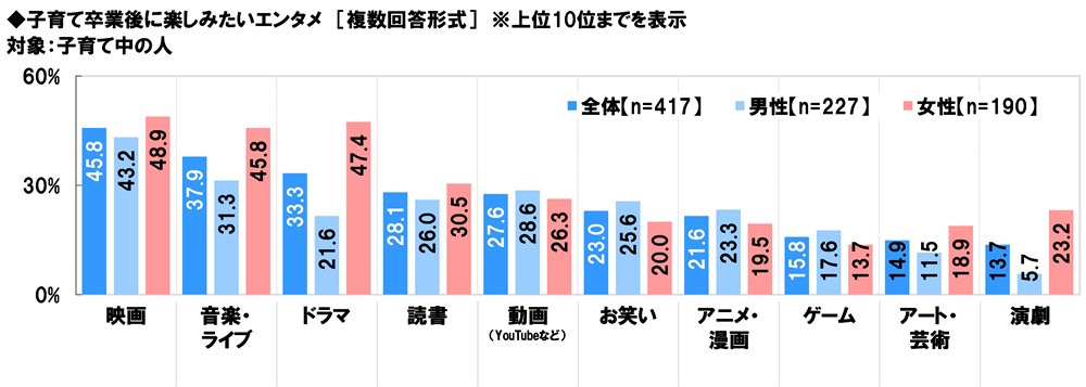 子育て卒業後、実際に楽しんでいるエンタメ 1位「映画」2位「ドラマ」3位「音楽・ライブ」